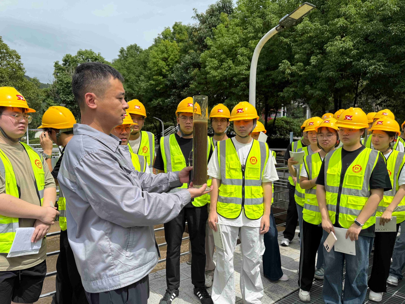 活動(dòng)現(xiàn)場(chǎng),工作人員首先向師生們介紹了污水處理廠的概況及運(yùn)行情況,隨后,帶領(lǐng)大家依次參觀細(xì)格柵、生化池、消毒池、出水口等污水處理設(shè)施,系統(tǒng)講解污水從收集、處理到達(dá)標(biāo)排放的全流程工藝。在互動(dòng)問答環(huán)節(jié)中,現(xiàn)場(chǎng)工作人員針對(duì)污泥處置、水質(zhì)監(jiān)測(cè)等問題進(jìn)行專業(yè)講解,并通過現(xiàn)場(chǎng)陳列處理前后的水樣對(duì)比,讓師生們直觀見證污水處理成效,深化環(huán)保知識(shí)認(rèn)知。